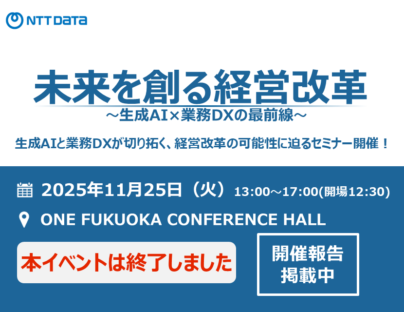 近年の生成AIの進化は著しく、企業経営の在り方そのものに変革をもたらすと予測されます。一方、各社様に置かれましては、 業務DX・人的資本の補い方など、現代社会の最前線に立ち続けるために、日々ご検討を重ねていらっしゃることと存じます。 本セミナーでは、『生成AI』と『業務DX』という二本の柱を軸に、生成AI及び会計・人事領域における変革のステップをご紹介します。 導入経緯や現場での活用事例、経営改革の展開に至るまで、具体例を用いつつ解説いたします。 AI活用を検討中の企業様や、業務DXに向けた取り組みを進めている企業様に向けて、次の成長につながるヒントをお届けします。 生成AIと業務DXで進める経営改革の可能性をともに考える場として、ぜひご参加ください。 ▼詳細とお申し込みはこちらから▼ 未来を創る経営改革_リーフレット 2025年11月25日、ONE FUKUOKA CONFERENCE HALLにて、「未来を創る経営改革~生成AI×業務DXの最前線~」を開催いたしました。 本セミナーでは、生成AIと業務DXの二本の柱を軸に、企業のDX推進とAI活用に関する最新動向をテーマとして、各分野の専門家が講演を行いました。 お客様である西日本鉄道様に開催協力及びご協力いただき、パートナーとしてグループ会計の導入に携わった私共NTTデータ九州のプロジェクト推進や導入後のフォロー体制や内容に関してもご評価をいただきました。 また、NTTデータ九州は、NTTデータグループで販売展開している生成AIアプリケーション開発プラットフォームである「つなぎAI」を用いたデモンストレーションを実施し、生成AIの活用事例や今後の可能性についてデモンストレーションを交えながら講演しました。 これからも、生成AIの知見と業務DXの推進力を掛け合わせ、お客様の多様なニーズに応える価値創出に取り組んでまいります。 そして、お客様の期待を超える価値を提供し、九州の未来を支えるパートナーとして挑戦を続けてまいります。