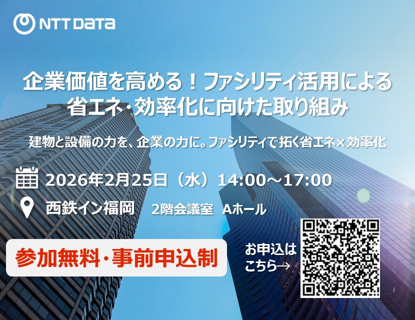 昨今、異常気象などの気候変動問題やエネルギー価格の変動への対策として省エネ等の 取り組みが加速しつつあります。 また、持続的な経営基盤を構築するためにも建物・設備を 含むファシリティ全体の最適化が要課題となっています。 本セミナーでは、『省エネ』と『効率化』を軸に、導入経緯や現場での活用事例を解説いたします。 ファシリティを活用した省エネや業務効率化をご検討中の企業様や、実際に取り組みを進めている企業様に向けて、次の一歩につながるヒントをお届けします。 ファシリティによる経営効率の可能性をともに考える場として、ぜひご参加ください。 ▼詳細とお申し込みはこちらから▼ ファシリティセミナー_リーフレット